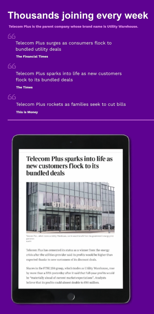 Started in 1997, Telecom Plus, which operates Utility Warehouse, has grown into a company with a turnover of over £1.8 billion, over 1 million customers and whose shares are traded on the London Stock Exchange. This phenomenal growth has been achieved by word of mouth ‘referral marketing’ by people like you who we call partners.