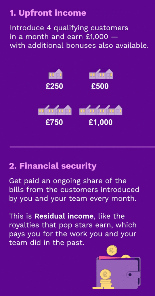 Simply show friends and people you know how to save money on their essential bills including broadband energy mobiles and home insurance. Earn up to £400 for each customer you introduce. The more customers you introduce the more you can earn. Just 1 customer a week could earn you an extra £1600 a month PART TIME from home!.
